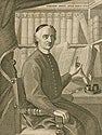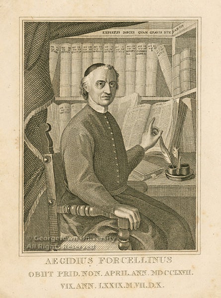 Egidio Forcellini was an Italian philologist who devoted his life to the assembling of the first Latin Lexicon (or Dictionary), which he labored on for some 35 years, but died eight years before its completion. Forcellini was born to a poor family from Treviso and entered seminary study in Padua. He was eventually ordained to the priesthood and served as both rector and father confessor at seminaries in Ceneda and Padua. The books on the shelves behind Forcellino in this engraving are presumably the volumes of his Lexicon.