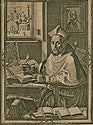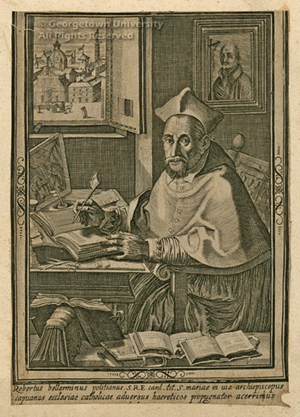 The subject of this engraving is the Jesuit Cardinal Roberto Francesco Romolo Bellarmino, who was canonized by Pope Pius XI in 1930. Perhaps his greatest achievement was the multi-volume publication of the Disputations or Disputationes de Controversiis Christianae Fidei adversus hujus temporis Haereticos (1581–93). This work of dogmatics was a defense of papal power and the first attempt to systematize the religious controversies of the time. In this engraving the influential Cardinal is writing at his desk with an array of books on a ledge in the foreground. The unknown engraver reveals a wealth of detail, from the micromosaic portrait on the wall to the view of a church through the window.