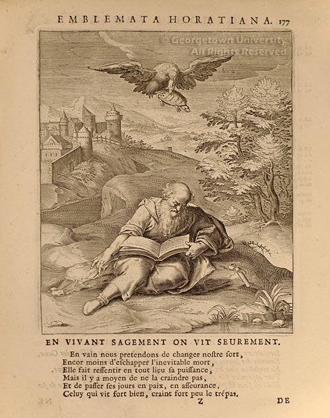 The engraved plates in this emblem book, first published in 1612, are attributed to Gijsbert Van Veen (1558-1630), brother of the author. Among other distinctions, Otto Van Veen is known today as the teacher of his more famous pupil, Peter Paul Rubens. Below each engraved plate is a verse in French from Horace and other authors, with Latin and French glosses on the facing page.