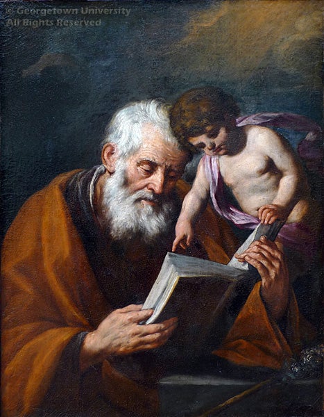 The subject of this painting is believed to be Saint Joseph since he was the only saint associated with a flowering staff, shown in the lower right corner of the composition. A story in the Protevangelium of James explains how Joseph was chosen to become Mary’s husband. According to this gospel, Mary’s suitors were asked to bring in their walking sticks and leave them in the temple overnight. By the next morning, the staff belonging to Joseph had blossomed with flowers, indicating divine favor.
