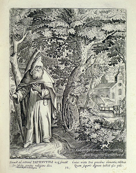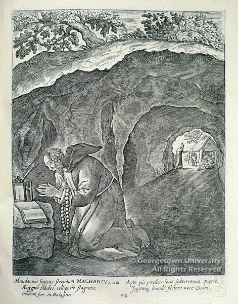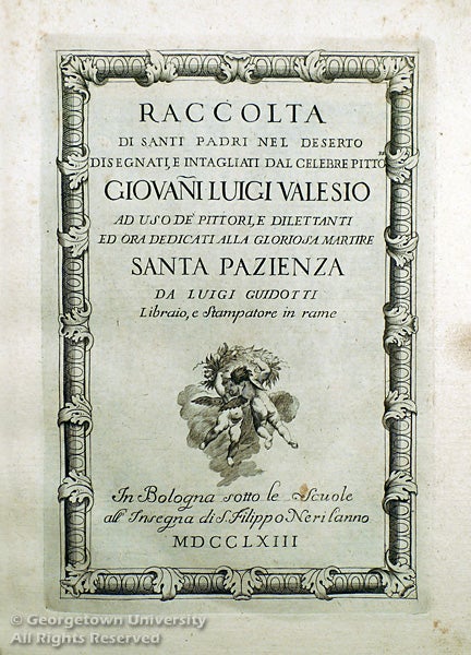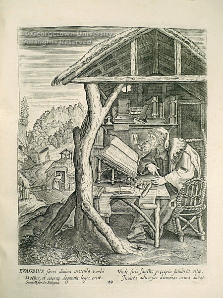 The 31 engraved plates in this rare volume depict the desert fathers and saints engaged in reading, praying, or some form of labor, each accompanied by a few lines of verse. The additional engraved frontispiece portrays Saint Lawrence.
