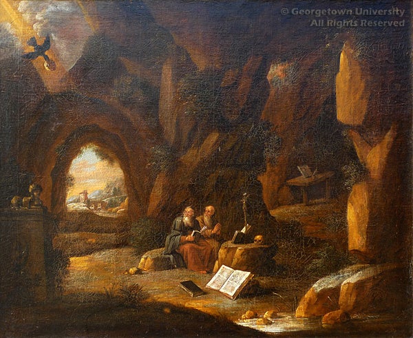 Known primarily for his rustic genre scenes, the Antwerp painter David Teniers the Younger rose to a position of titled nobility as court painter to Archduke Leopold William in Brussels. His paintings became highly prized in the following century and were collected by royal patrons such as Catherine the Great of Russia, who owned twenty-two examples of his work. This painting depicts the story told by St. Jerome of St. Anthony’s visit to St. Paul, when the two hermits were miraculously fed by a raven bearing a loaf of bread.