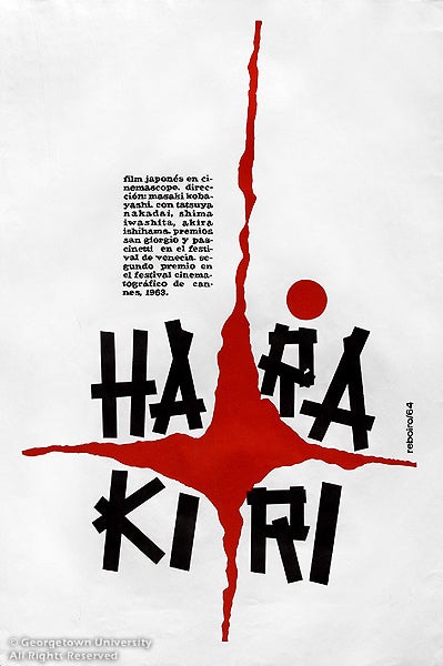 Synopsis: An elder samurai warrior, instead of committing seppuku (ritual suicide, better known in the West by the colloquial term harakiri) after his lord was deposed, was ordered to stay alive. Reboiro’s poster for Harakiri won a prize in the International Film Poster Competition organized by The Cinema Sixteen Society of Ceylon (Cambodia) in 1965. Its forceful and simple design, a jagged red cross, suggests the violent nature of the film without being explicit.