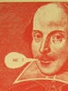 This stamp from the United States Post Office Department (now Postal Service) commemorated the four-hundredth anniversary of William Shakespeare's birth. The block of eight was cancelled on the first day of issue in, appropriately, the town of Stratford, Connecticut, then home of the American Shakespeare Festival Theatre and Academy. The description in Postage Stamps of the United States notes, "Beside [the quill] rests the most celebrated skull in theatredom, that of 'alas, poor Yorick.'"*