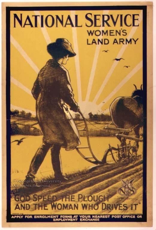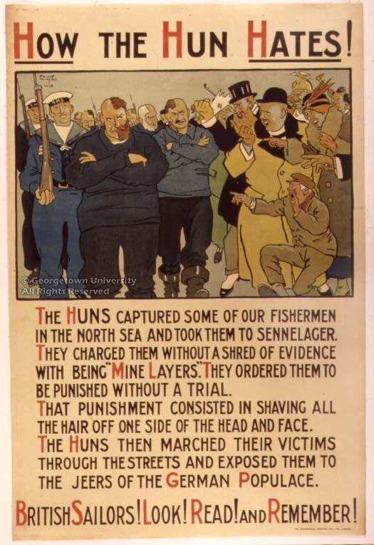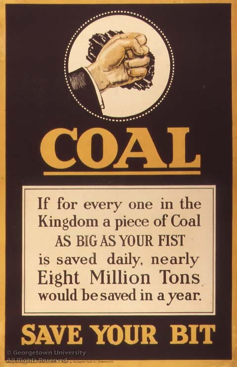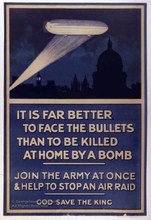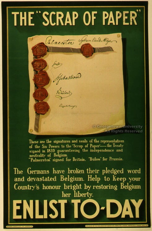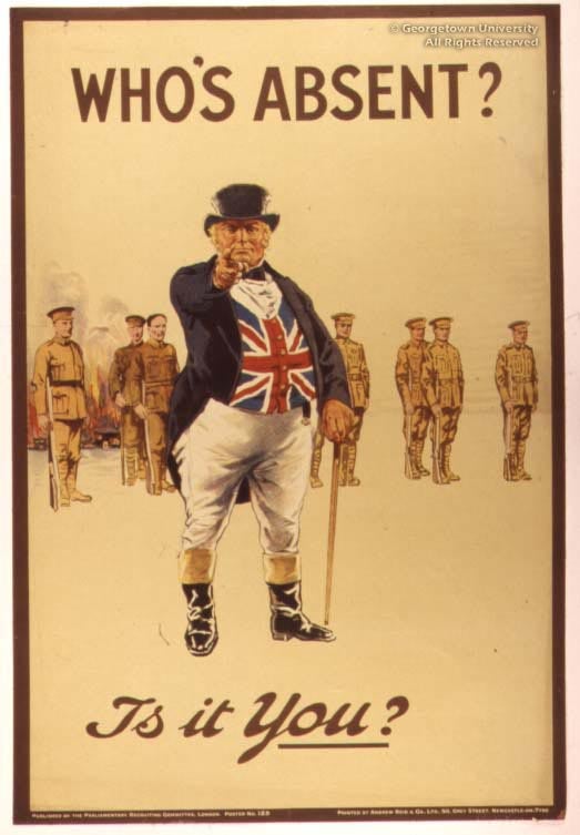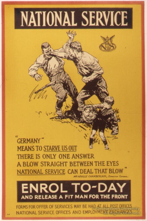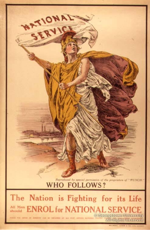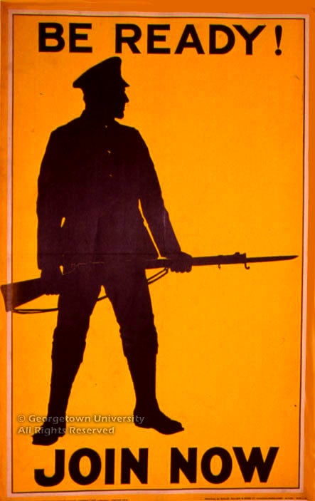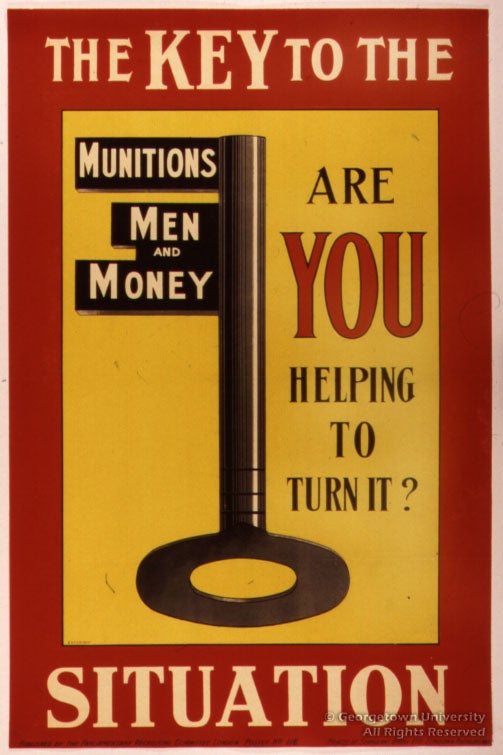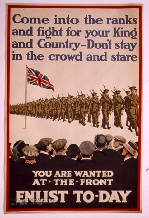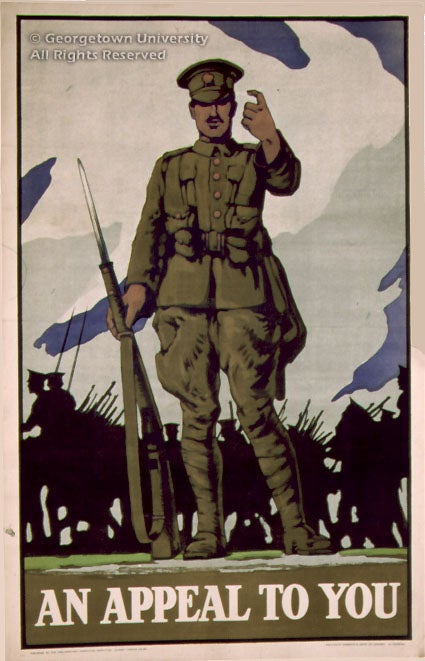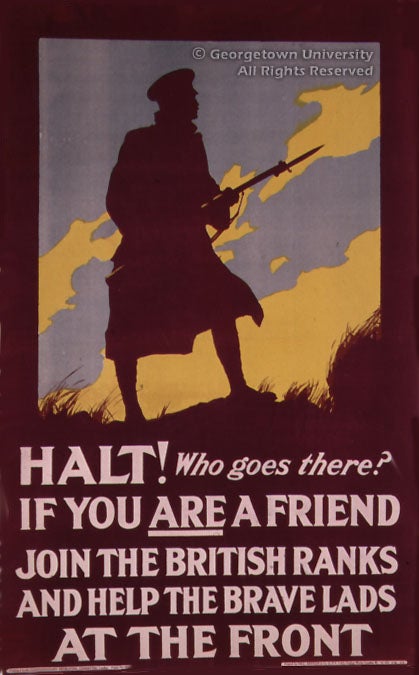 The Roger N. Mohovich Collection contains, counting duplicates, rather more than 400 posters created during the First World War or very shortly afterwards. Well over 300 of the posters are American, as is only to be expected; of the remainder, some 50 are of British origin. These British posters are by no means so well known in this country as many of the American ones, and it is hoped that awareness of them will be increased by means of this exhibition—and particularly its installation as part of the library’s web site. The 25 examples selected, although they include examples by neither of the best-known British war poster artists, Frank Brangwyn and G. Spencer Pryse, display most, if not all, of the stylistic and thematic ideas which typify British poster art during the war.