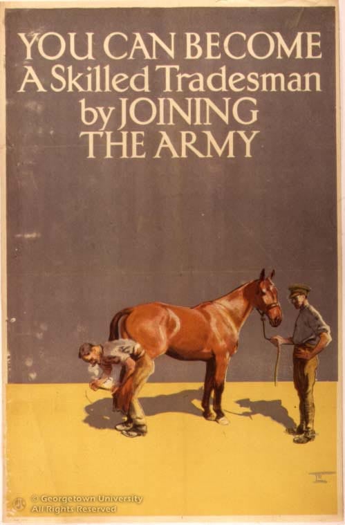 There is little need here to repeat in miniature the history of First World War posters; interested readers or viewers are urged to consult the texts by Martin Hardie and Arthur K. Sabin (War Posters, London: A. & C. Black, 1920) and Maurice Rickards (Posters of the First World War, New York: Walker, 1968). The roughly chronological arrangement of the posters in the exhibition reveals the initial concern with recruiting, followed as the war dragged on by no less necessary demands on the civilian economy and a need to blacken utterly the character of “the Hun.” The single post-war example shown demonstrates a far different approach to recruiting, if perhaps one that relies overly on the continued viability of a horse-drawn economy. Posters illustrated in the books by Hardie/Sabin and Rickards are so noted in the brief descriptive entries for each work.