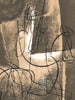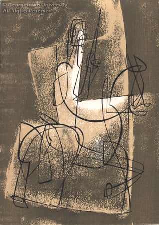 This intriguing abstract line representation of Don Quixote with his lance atop his faithful steed Rocinante was the "membership edition" for the Albany Print Club in 1951. In the presentation essay for the print, Bate's Don Quixote was said to be "the sad old gentleman distilled to essence." One can speculate on the influence of the "wire sculptures" of Alexander Calder (1898-1976) in conceiving the work's formal approach.