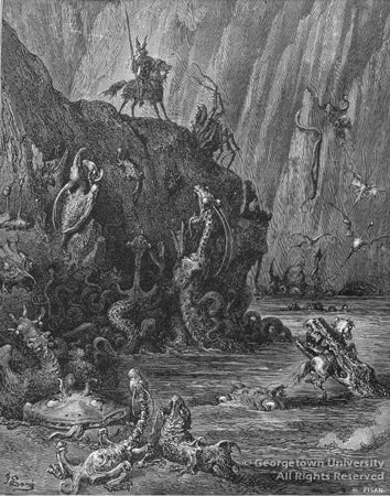 The prolific, virtuoso etcher and engraver Gustave Doré completed illustrations for several classic works of literature, including La Commedia by Dante Alighieri, Paradise Lost by John Milton, and The Bible. The approximately 180 illustrations eventually published for Don Quixote in 1864 are among Doré's most famous, and have been reproduced in editions in a number of languages. This edition is open to Doré's depiction of Don Quixote's reference to "a great lake of pitch, boiling hot, and swimming and writhing about in it, a swirling mass of serpents, snakes, lizards, and many other kinds of grisly and savage creatures..." during his argument with the canon, from chapter 50 of Part 1.