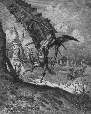 Illustrations: top: Windmills by Lucille Gilling (1905-1997), from A Portfolio of Ten Etchings by Lucille Gilling based on Don Quixote de la Mancha, by Miguel de Cervantes (Willowdale, Ontario: The Studio, 1968); color etching; ed. 14/100; 24.8 x 21.3 cm; Georgetown University Fine Print Collection; lower: Tilting at Windmills by (Paul) Gustave Doré (1832-1883), from The History of Don Quixote by Cervantes, ed. J. W. Clark, and a biographical notice of Cervantes by T. Teignmouth Shore; illus. by (Paul) Gustave Doré (New York: P.F. Collier, 1863).