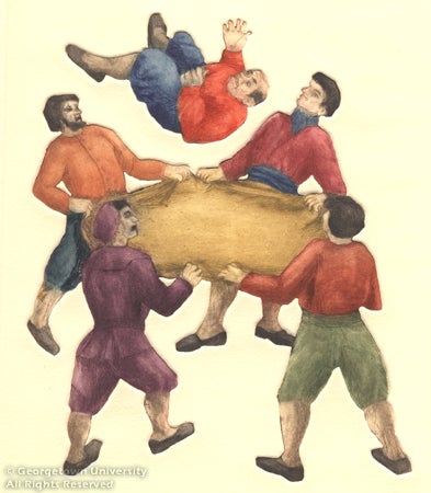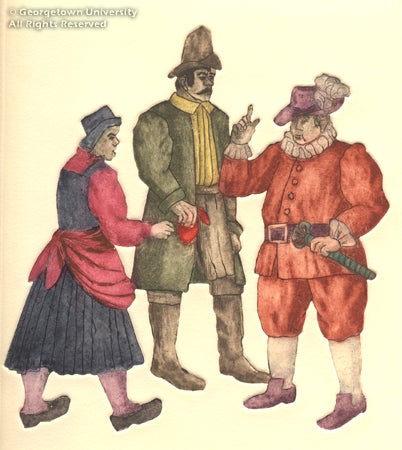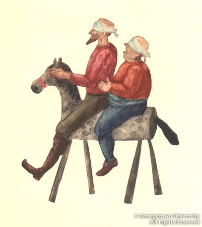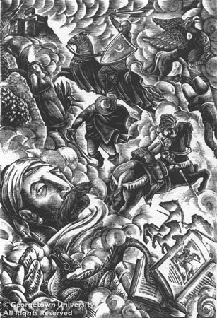 Tilting at Windmills: Don Quixote at 400 includes art and rare books from the Georgetown University Library's Special Collections division, including a series of engravings by eighteenth-century English master printmaker William Hogarth, ten embossed color etchings by Canadian artist Lucille Gilling, a color woodcut by Hans Alexander Mueller, a color wood engraving by Stanley Bate, and a lithograph by Czech artist Bohumil Krátký; and handsome editions of the novel, such as a 1780 set from Madrid and a nineteenth-century tome illustrated by Gustave Doré.
