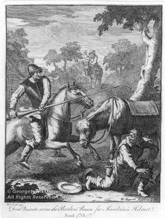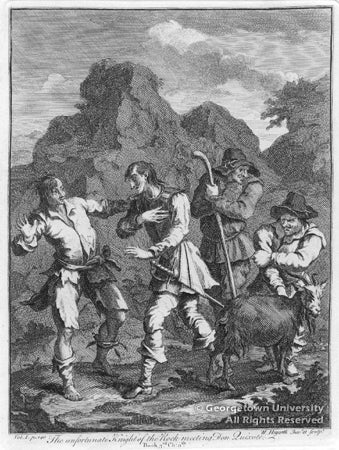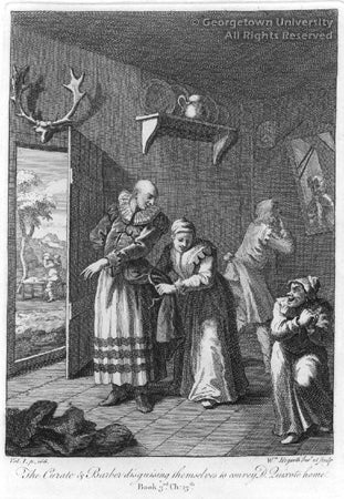 Georgetown University Library owns four of the six engravings, titled above. The other two are: The Funeral of Chrysostom and Quixote Being Cared for by the Innkeeper’s Wife and Daughter. All scenes are from Part 1 of the novel.