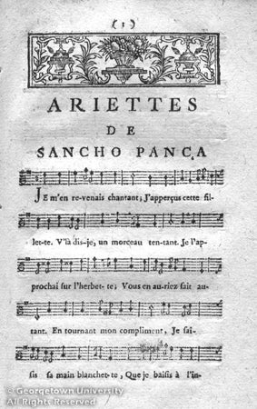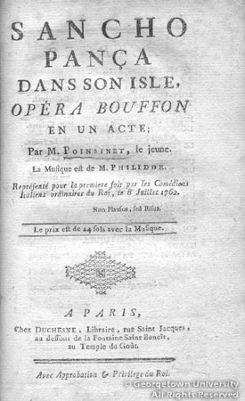 François-André Danican Philidor was an early composer of "comic operas," who collaborated with librettist Antoine Alexandre Henri Poinsinet on a number of Philidor's more commercially and artistically successful works. Sancho Pança Dans Son Isle is based on the episode from chapter 45 of Part 2 of Don Quixote in which the knight-errant's sidekick is made governor of the island of Barataria. This opera is one of several works in the exhibition that highlight the continuing influence of Don Quixote on not only the visual arts, but in other art forms as well.
