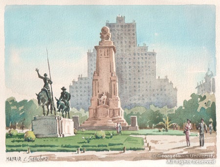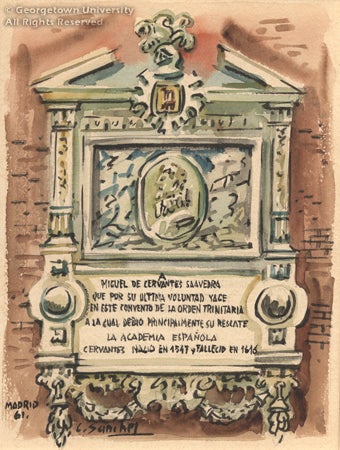 These watercolor views are of the Trinitarian convent with the memorial on its façade to Cervantes, and the Cervantes monument on the Plaza de España in Madrid. The watercolors were acquired by Georgetown University's Francis L. Fadner, S.J. (1910-1987), Third Regent of the University's School of Foreign Service and professor of history, during one of his sojourns in Spain. They are by a Spanish artist born in Bilbao, who founded an artists' society in that city called Nueva Bohemia; he was a noted painter of landscape and still-life.