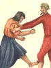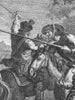 Tolerance as a theme is brought out most beautifully, I believe, in the extended episode of the Christian captive, beginning in Chapter 33, where we are first introduced to Zoraida, an attractive, devout Moorish woman. For this episode there are five prints accompanying the text, in the Aguilar edition. In the 1863 American edition (Putnam, New York), where all the illustrations are by Gustave Doré, there are six prints related to the same episode. Also noteworthy are illustrations of the early title pages in the six-volume Spanish edition of 1905, which celebrated the three-hundredth anniversary of the novel. In this episode, we learn that a Christian naval captain was captured in the Mediterranean area and held prisoner in North Africa. The largely open air prison is next to the house of a rich Moor, father of Zoraida. She becomes attracted to the Christian captive, and communicates with him by means of messages dropped from her window. The two are united, and with strong insistence from Zoraida they escape to Spain, not without some harrowing difficulties. (Doré contributes a beautiful print depicting an attack on their vessel by a French boat.) They finally arrive at a Spanish inn, she on a mule with the Christian man walking at her side. She wishes to be called "Maria," recalling the tales of a Christian servant who regaled her with accounts of the Virgin Mary. As with Joseph and Mary, there is no room at this Spanish inn, although Dorotea, a prominent figure in the novel, welcomes her and provides hospitality. At the inn, the Christian captain relates his story to Don Quixote and others with him.