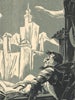 This two-volume Don Quixote was one of the early issues from the Limited Editions Club, founded during the Great Depression by publisher George Macy (1900 - 1956) to provide quality cloth editions of classic and important contemporary books, with fine illustrations, by annual subscription for a middle-class market. Macy would contract with printers around the world to produce the books; Don Quixote was printed by Oliva de Vilanova of Barcelona, which hired noted Barcelona portraitist and illustrator Enric-Cristófol Ricart. This engraving facing the title page shows Ricart's Art Deco interpretation of the famous "imagination" scene from chapter 1, represented elsewhere in this exhibition with works by Doré and Mueller. A catalogue raisonné of Ricart's prints was published in 1988.