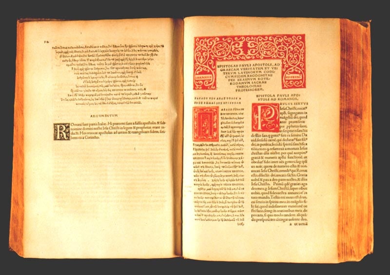 Bible. New Testament. Greek and Latin. Erasmus. 1516. Novum instrument_ omne, diligenter ab Erasmo Roterodamo recognitum & emendatum. First edition of the first publication of the New Testament in the original Greek, together with Erasmus' own translation into Latin, with his extensive commentary. Bound in original alum-tawed pigskin over wooden boards, clasps lacking. Inscribed "Duplum Bibliothecae Regiae Monacensis" on front pastedown. Acquired with the library of Rev. Thomas C. Levins, 1844.