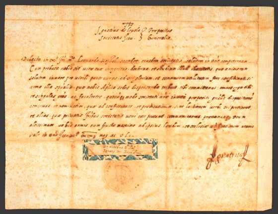 Document, signed. [Rome] 22 May 1551, one page, in Latin. A grant of faculties (or celebret) sent by the founder of the Society of Jesus to one of its early members, Fr. Leonard Kessel. A fragment of bone from the skeleton of Ignatius was added to the document at a later date. Gift of Mary Benjamin in honor of Father Francis X. Talbot, S.J., 1944.