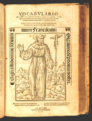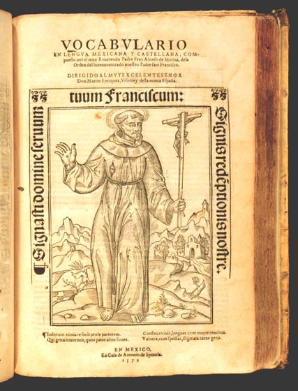 Vocabulario en lengua castellana y mexicana. Two volumes bound in one. First edition of the first great Native American vocabulary, with contemporary manuscript additions to the first section in a second Native American language. First title leaf in facsimile. Bound in early (but probably not contemporary) full vellum (ties missing). Bookplate of Otto Orren Fisher. Purchase, 1971.