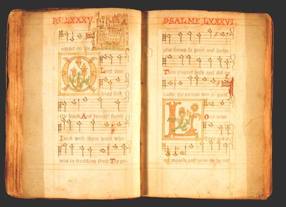 Autograph illuminated manuscript, signed. 164 pages. The altus part from the second set of what is generally known as the "St. Andrews Psalter" or "Scots Psalter," Wood's compilation of the Psalms in English in four-part polyphonic settings by the Scots composer David Peebles; at the end are added a number of other religious and secular songs. Despite the date in the manuscript (given above), composition of the manuscript may perhaps have begun as early as 1570. Bound in somewhat later half calf and marbled paper boards. Acquired from an undetermined source prior to 1937.