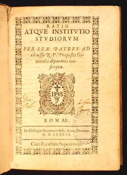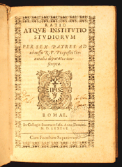 Ratio atque institutio studiorum per sex patres ad id iussu R. P. Præpositi Generalis deputatos conscripta. First edition of the foundation work in Jesuit educational theory and practice. Bound in contemporary limp vellum, with the near-contemporary inscription on the title page of a Jesuit house in Bologna. From the collection of Sir Leicester Harmsworth. Purchase, together with the second edition (1591), on funds provided by Homer Hervey, Paul Straske, and Mrs. S. R. Straske, 1986.