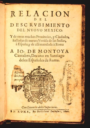 Relacion del descrubimiento del Nuovo Mexico: Y de otras muchas Provincias, y Ciudades, halladas de nuevo; Venida de las Indias, à España, y de alli mandada à Roma. First edition of this early account of the exploration of present-day New Mexico; one of only two recorded copies. Bound in the 19th century in three-quarter sheep and marbled paper boards. Acquired from an undetermined source prior to 1970, possibly with the library of John Gilmary Shea.