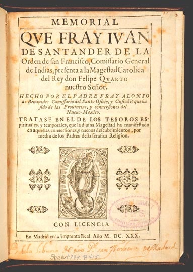 Memorial que Fray Iuan de Santander de la orden de san Francisco, Comissario General de Indias, presenta a la Magestad Catolica del Rey don Felipe Quarto nuestro Señor. Hecho por el Padre Fray Alonso de Benavides Comissario del Santo Oficio, y Custodio que ha sido de las Provincias, y conversiones del Nuevo-Mexico. First edition of the most important contemporary account of life in the American Southwest during the early colonial period. Rebound in recent full calf. Purchase, 1892, with the library of John Gilmary Shea.