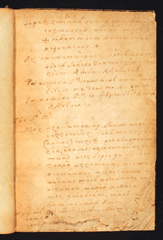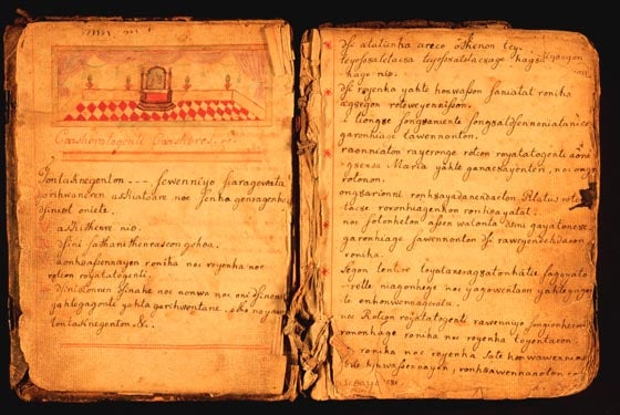 Untitled autograph (?) manuscript. Caughnewaga or Sault St. Louis (Canada), ca. 1700, about 75 leaves (including some fragmentary), in Mohawk, with a few notes in Latin and French. Attributed with some confidence to the Jesuit missionary Bruyas, the author of a scholarly treatise on Mohawk vocabulary. This manuscript, in all likelihood incomplete, contains a fragmentary liturgy of parts of the Mass followed by extensive translations into Mohawk of traditional Latin and French hymns. Bound in deerskin (?) with metal clasps. Part of the collection of manuscripts formed by John Gilmary Shea; gift of Sophie S. Shea and Elizabeth Shea, 1893.