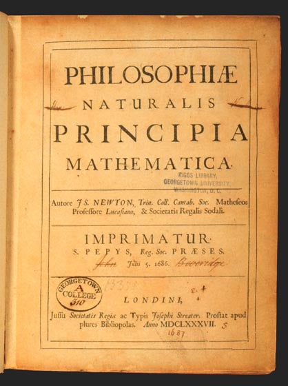 Philosophiæ naturalis principia mathematica. First edition of the cornerstone work in traditional physics. Rebound in 20th century full calf. Early ownership signature of John Beveridge, slightly later signature of Fr. Henry Neale, S.J., active in Philadelphia from 1740 to 1748. Acquired, probably as the gift of a Jesuit house or an individual Jesuit, prior to 1836; with the alphanumeric pressmark of the original Georgetown College Library collection on the title page.