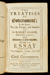 Two Treatises of Government. First edition of one of the key titles in the development of modern, and especially American, political science. Bound in original (?) full calf. In part, unopened (and therefore in part unread). Early ownership inscription of J. Langston; 20th century bookplate of Henry G. Burke, Baltimore. Purchase, 1983.