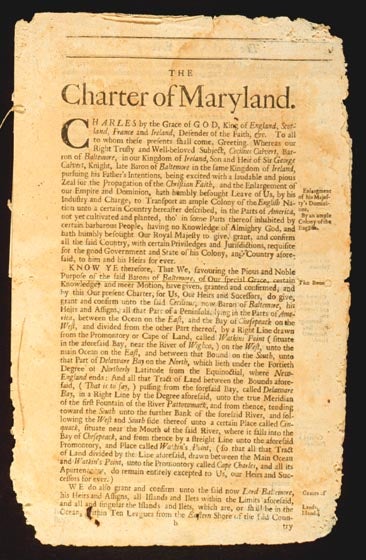 The Charter of Maryland. First printing, slightly imperfect, with small portions of text on the last two leaves missing. Stitched (as issued?), and docketed on the final blank leaf by Fr. William Hunter, S.J. (1659-1723), superior of the Maryland Jesuit mission at least from 1696 until his death. The only known copy. Deposited at Georgetown with the archives of the Maryland Province of the Society of Jesus, 1975.
