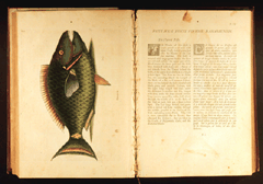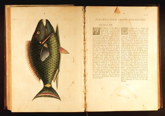 The Natural History of Carolina, Florida and the Bahama Islands: Containing the Figures of Birds, Beasts, Fishes, Serpents, Insects, and Plants: . . . not hitherto described, or very incorrectly figured by Authors. . . . Vol. I [II] Two volumes bound in one. First edition, a small number of plates wanting. With the signature on the first title leaf of John Custis of Williamsburg, with whom Catesby stayed briefly while doing the field work on which the book is based, and from whom the book passed to Martha Custis Washington. Bound (or perhaps rebound) at Georgetown College in full calf in the mid-19th century. Gift of George Washington Parke Custis on the occasion of his addressing a Georgetown College commencement, July 4, 1833.