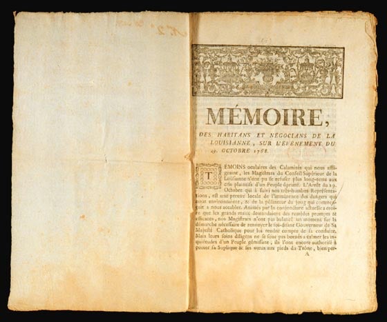 Mémoire, des habitans et negocians de la Louisianne, sur l'événement du 29. octobre 1768. First edition of the first book printed in Louisiana, a petition asking the restoration of the colony to France; authorship sometimes attributed to Nicolas Chauvin de Lafrénière (d. 1769) or to Julien Doucet. Imprint reproduced from the colophon. Original plain wrappers, with an official French manuscript attestation to the document's authenticity, dated 6 October 1769, on the final leaf. The only copy recorded in the United States. Purchase, 1892, with the library of John Gilmary Shea.