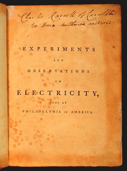 Experiments and Observations on Electricity, Made at Philadelphia in America. . . . The Fifth Edition. The most complete edition of Franklin's scientific treatise. Inscribed on the half-title, in the hand of the recipient, "Charles Carroll of Carrollton Ex Dono Authoris [scratched out] auctoris." Bound in original full sheep (rebacked). Purchase, 1892, with the library of John Gilmary Shea.
