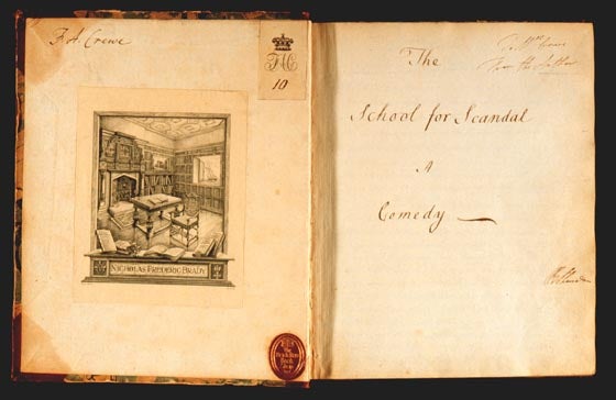 The School for Scandal A Comedy. Manuscript, signed. 173 leaves. Copyist's manuscript of Sheridan's comedy, with numerous notes and corrections throughout in the author's own hand, including attributions of the prologue to David Garrick and the epilogue to George Colman, and with his presentation inscription to Mrs. (afterwards Lady) Crewe and signature on the title leaf. Bound in contemporary three-quarter red morocco and marbled paper boards. Bookplates of F. A. Crewe (after 1806) and Nicholas F. Brady. Gift of Mrs. Nicholas F. Brady, 1935.