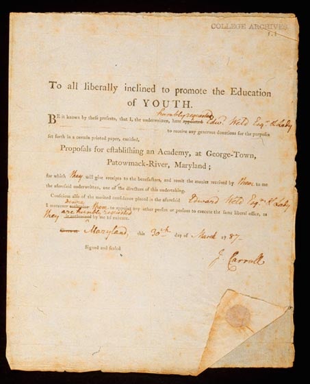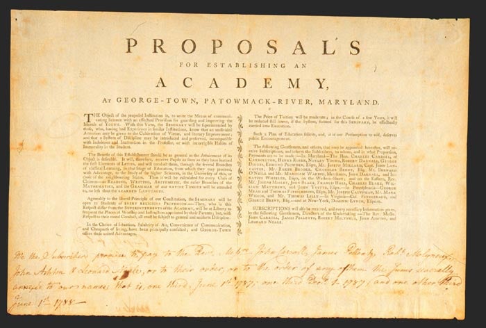Proposals for Establishing an Academy, at George-Town, Patowmack-River, Maryland. First printing of the foundation document of Georgetown University, including the typically American wording "Agreeably to the liberal Principle of our Constitution, the Seminary will be open to Students of every religious persuasion." One of the copies distributed in the United States by Carroll: ironically, the recipient docketed the back "Prospectus for building The College of G. T.-- useless." Acquired by the University Archives from an undetermined source prior to 1970.