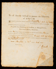 To all liberally inclined to promote the Education of Youth. First printing of the future Archbishop Carroll's letter soliciting funds for his projected academy at Georgetown, accomplished in manuscript and directed to Edward Weld and his wife at their estate, Lulworth, near Wareham, in Dorset. The only known copy. Acquired by the University Archives from an undetermined source prior to 1970.