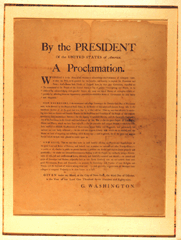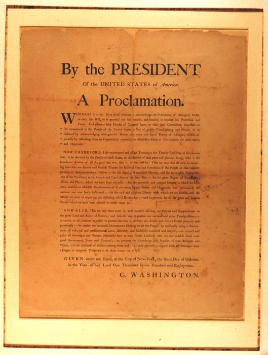 By the President of the United States of America. A Proclamation. First printing of the broadside proclaiming the first national day of Thanksgiving. One of only six recorded copies. Presented as the Georgetown University Library's official 2,000,000th volume; gift of Marshall Coyne, 1994.