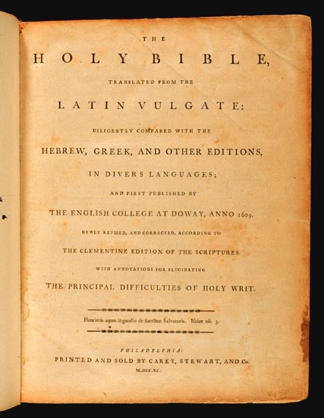 The Holy Bible, Translated from the Latin Vulgate: Diligently Compared with the Hebrew, Greek, and Other Editions, in Divers Languages; and First Published by the English College at Doway, Anno 1609. Newly Revised, and Corrected, According to the Clementine Edition of the Scriptures with Annotations for Elucidating the Principal Difficulties of Holy Writ. First edition of the first Catholic Bible printed in America. Rebound in 20th century full black morocco. Purchase, 1892, with the library of John Gilmary Shea.