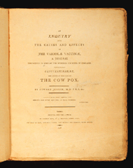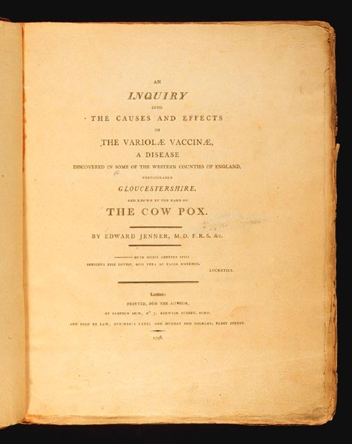 An Inquiry into the Causes and Effects of the Variolæ Vaccinæ. First edition of one of the noteworthy books in the development of modern medicine. Bound in contemporary marbled paper boards, cloth spine (possibly rebacked at a slightly later date). Gift of Mrs. G. William Schlindwein, prior to 1970.