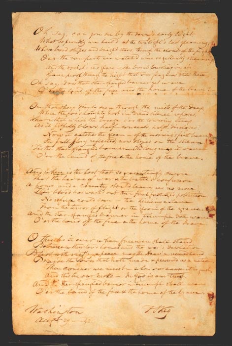 [The Star-Spangled Banner] Autograph manuscript, signed. 1 page. A fair copy, one of very few such extant, of the untitled text of the national anthem which Key composed in 1814, written out by the author for a Mr. Espy, possibly the Washington meteorologist James Pollard Espy (1785-1860). Gift of the recipient's daughter, Elizabeth McCalmont Espy (Mrs. J. A. Nunn), 1898.