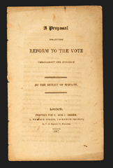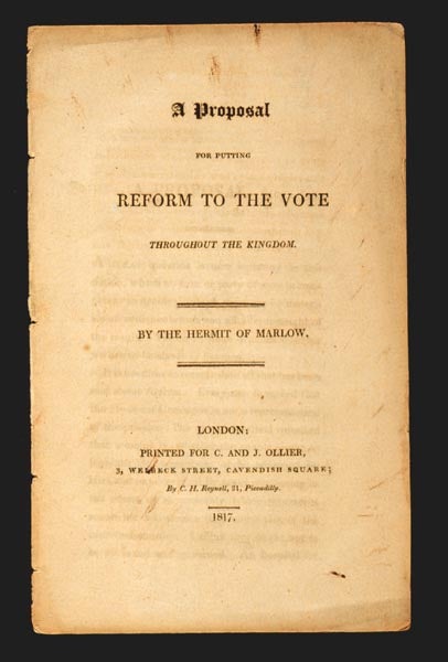 A Proposal for Putting Reform to the Vote Throughout the Kingdom. By the Hermit of Marlow. First edition of the poet's anonymously-distributed contribution to the ongoing debate on English political reform springing from both the nascent Industrial Revolution and the previous two and a half decades of political upheaval in France. Disbound. Acquired from an undetermined source prior to 1970.