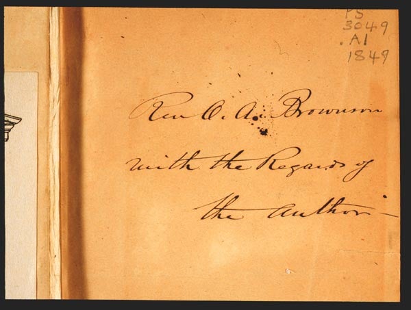 A Week on the Concord and Merrimack Rivers. First edition of the author's first book, inscribed by him on the front free endpaper: "Rev O. A. Brownson with the Regards of the author." After page 272 the text is unopened and therefore unread. Bound in the original cloth (rebacked). Purchase, 1985, with the rare book collection of the University of Detroit.