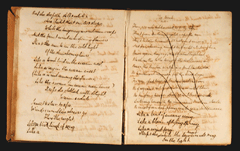 Poems. Autograph manuscript. 180 pages (on 91 leaves). Octavo-sized notebook containing drafts of a number of short poems, many only partial; parts of a long drama in verse about the Borgias and Paolo Orsini; and the beginning of a prose story concerning flagellation, all probably written during the latter years of the poets's course of study at Oxford. Bound in flexible black morocco gilt. Gift of Edith S. Mayfield, 1984.