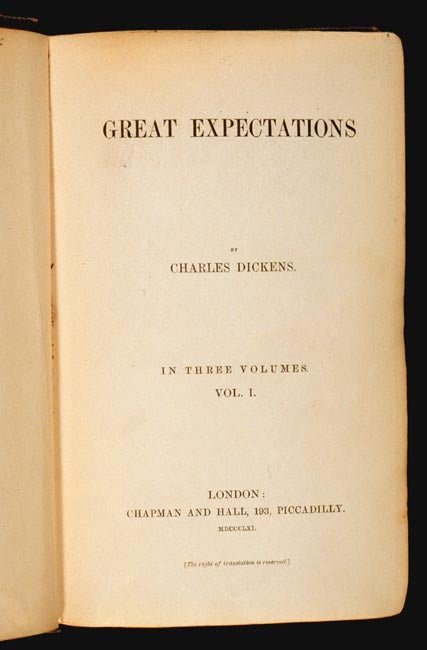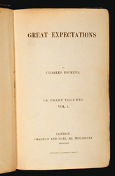 Great Expectations by Charles Dickens. In Three Volumes. Vol. I. [II-III] Three volumes. First edition, the true first printing of Dickens' only "three-decker." Bound in the original (much faded) violet cloth, lending library labels removed from the upper cover of each volume. Gift of Mary Ziegler Fockler, 1976.