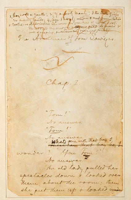The Aventures [sic] of Tom Sawyer. Autograph manuscript. 900 leaves. The original manuscript of Twain's novel, as sent for type-setting to the printer of the American first edition, including as a final afterthought in September, 1876, the wording for the book's dedication. Gift of Mrs. Nicholas F. Brady, 1934.