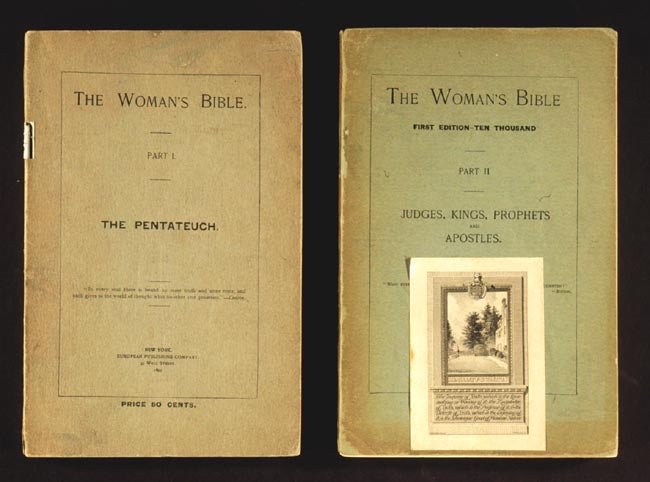 The Woman's Bible. Part I. The Pentateuch. [Part II: Judges, Kings, Prophets and Apostles.] Two volumes. First edition of this controversial attempt to overthrow the political and domestic subjugation of women as based on Biblical texts. Bound in the original paper wrappers, the bookplate of Margaret F. G. Whitney mounted on the cover of the second part. The first part is inscribed on a front binder's blank by Elizabeth Cady Stanton: "June 25, 1898 / Progress is the victory of a new thought, over an old superstition." Acquired from an undetermined source prior to 1970.
