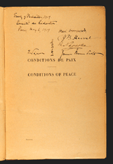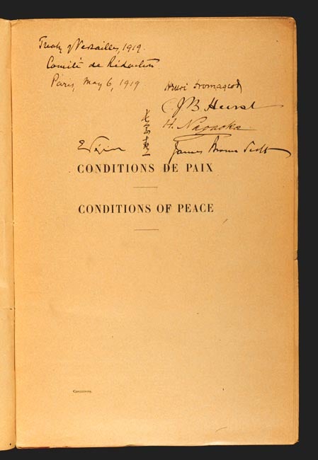 Allied and Associated Powers (1914-1920). Conditions de paix. Conditions of peace. Proof copy (upper wrapper stamped "Epreuve" with a numeral 5 added by hand) of the text of the Treaty of Versailles. With the separately printed Summary laid in at the back. Bound in the original paper wrappers. Autographed on the title leaf by four of the five original members of the Comite de Redaction (Central Drafting Committee), May 6, 1919, comprising Henri Fromageot (France, chairman), J. B. Hurst (British Empire), H. Nagaoka (Japan), and James Brown Scott (USA). Gift, together with the papers of James Brown Scott, of Eleanor Finch, 1968.