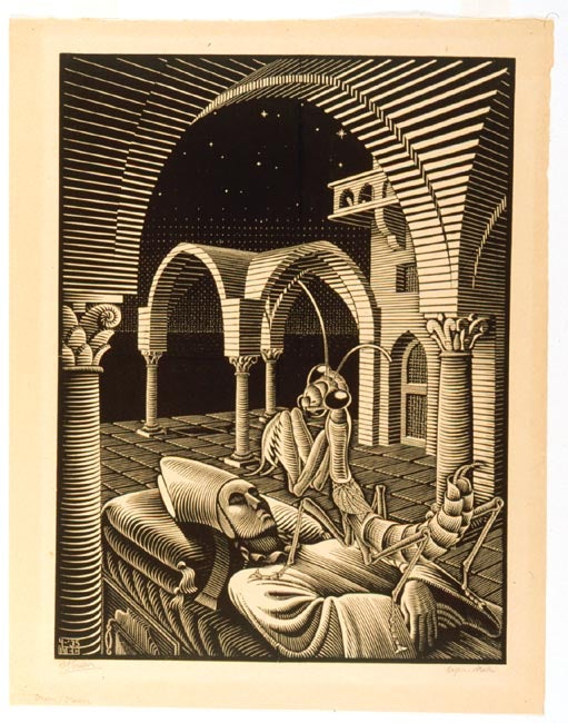 Dream (Mantis religiosa). Signed. One of the best-known and, to many, one of the most puzzling of the artist's early prints. This particular copy was the first print Escher sold in the United States, from his first show at the Whyte Gallery in Washington, D.C., a few years before World War II. Dated in the block. Signed in pencil at lower left and inscribed "Eigen druck" at lower right. Bequest of the original purchaser, Eric F. Menke, 1981.