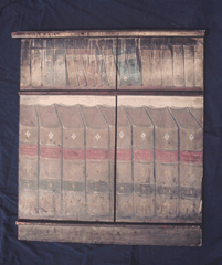 Oil on wooden panel. The surviving fragment of the painted door created by Simpson, Georgetown's first teacher of fine arts, for the "new" college library in the Old North Building. Names of Jesuits then teaching at Georgetown grace the folio tomes on the bottom shelf, each allied to the person's academic specialty; the florid penmanship of James Van de Velde, S.J., the librarian, is no doubt the reason for his "authorship" of the tome on calligraphy.