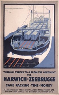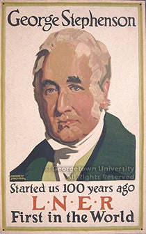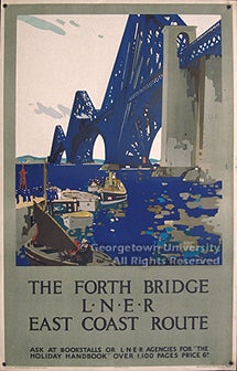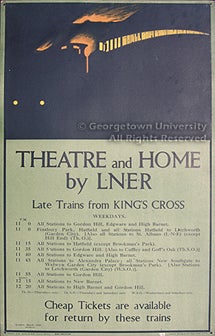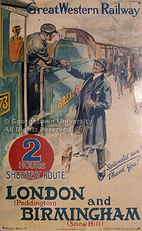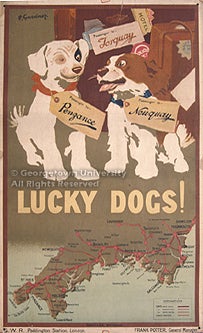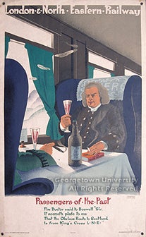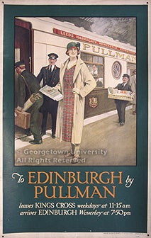 The posters in the exhibit are drawn from the large collection of American and European railroad publications, posters, and other ephemera formed by alumnus Jeremiah J. O'Connor, who received both undergraduate and graduate degrees from Georgetown in the 1930s; the collection was donated to the library in the 1960s by his sister, Margaret M. O'Connor. The posters represent the output of each of the "Big Four" railways as well as of the Pullman company, which advertised its services separately, and the Great Eastern Train Ferries. Entries give the name of the poster's designer (where known); its title; the place of printing and the lithographic firm responsible; and (where it can be determined with any exactitude) the date of publication. No indication of size is made, as all of the posters in the exhibit are in a vertical format, in what is known in Britain as the "double royal" size, approximately 40 x 25 inches.